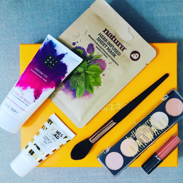 Good morning guys.. 🙂 This month’s theme is heatwave – the hottest summer EVER and the orange box contains a highlighter palette, highlighter brush, a face tan mask, a vegan sheet mask, a lipstick and body cream!